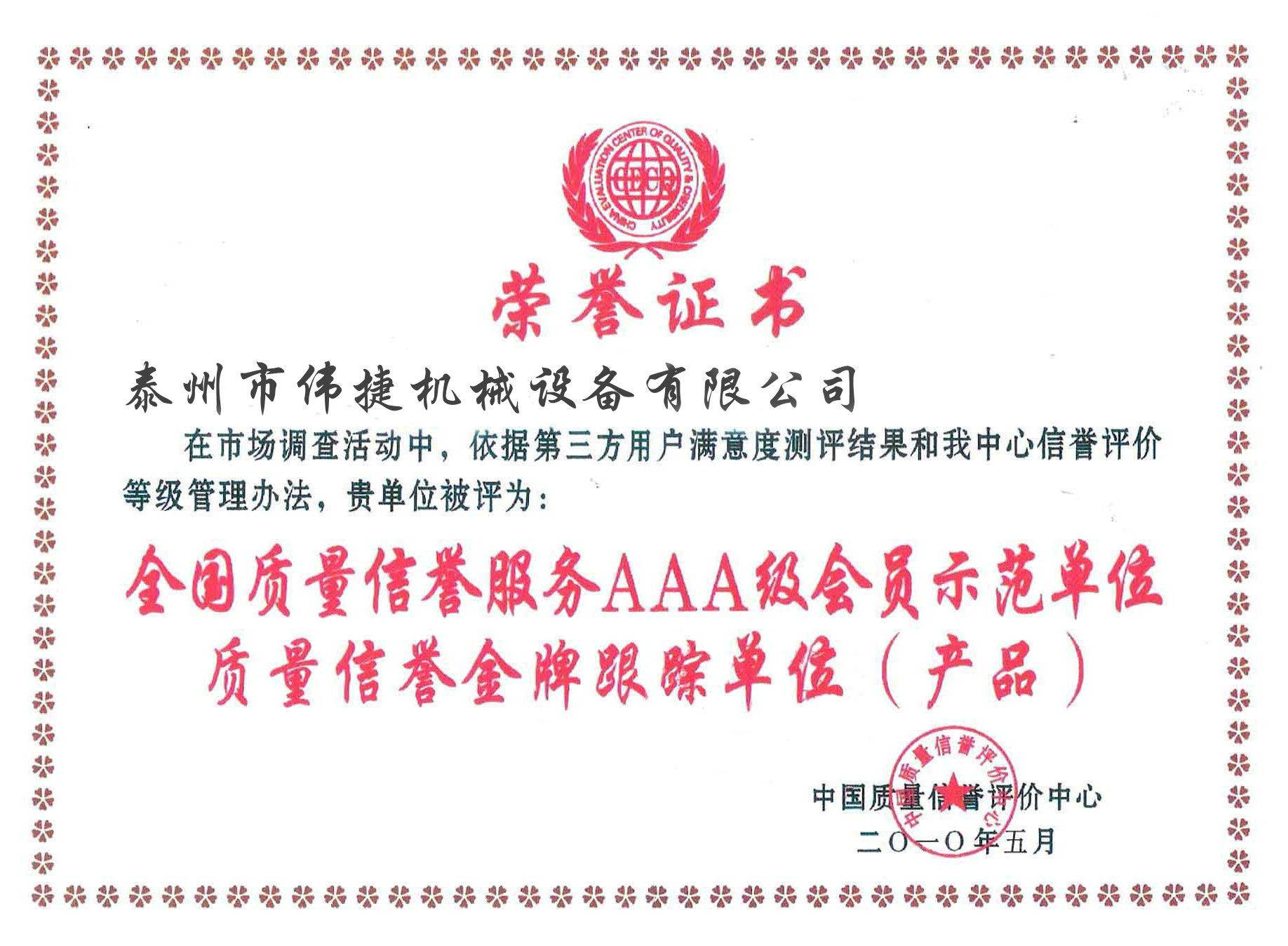 Weijie Machinery Equipment Qualification Certificate